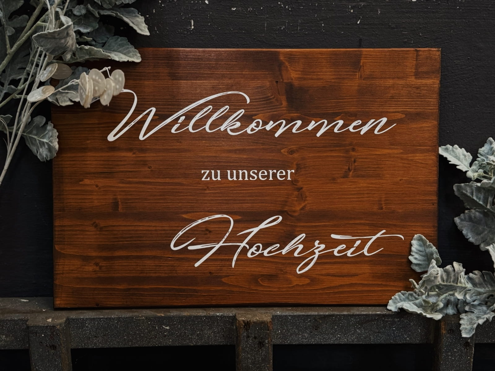 Jedes Schild wird mit viel Sorgfalt gefertigt und kann individuell auf Euch und Euer Hochzeitskonzept abgestimmt werden. Ob klassisch, modern oder im Vintage-Stil – wir gestalten Euer Willkommensschild passend zu Eurer Dekoration.
